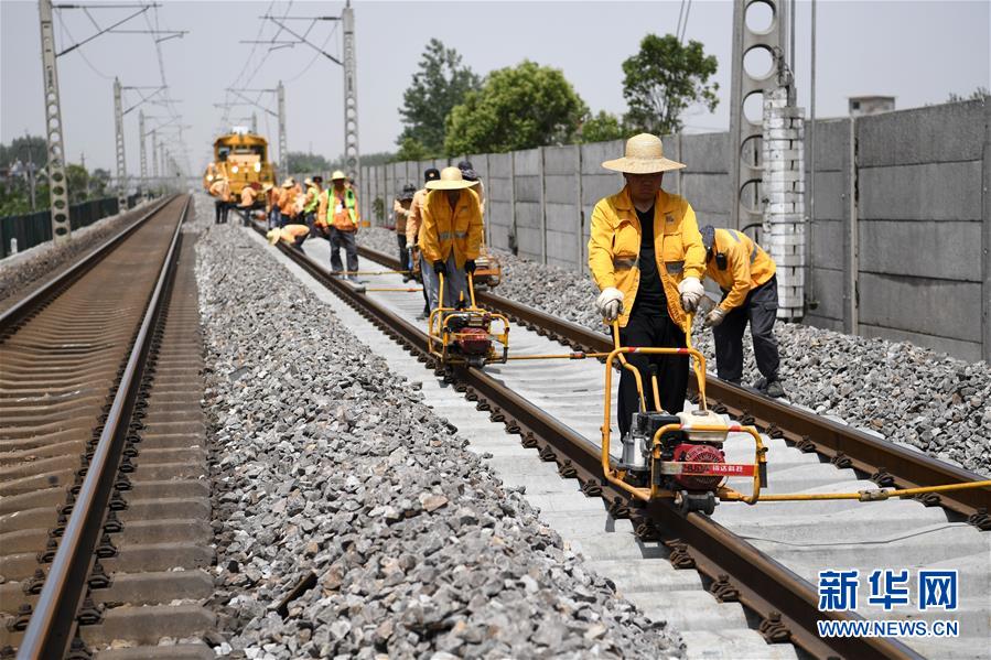 6月3日,施工人员在京九铁路线上进行更换水泥枕施工。 近日,由中国铁路上海局集团有限公司上海工务大修段、上海大机运用检修段等单位共同参与的京九铁路下行线颍南至三塔镇区间9.7公里水泥枕更换工程有序进行。换枕施工完成后,将进一步提升线路的安全性和稳定性,为即将到来的暑运保驾护航。 新华社记者 刘军喜 摄