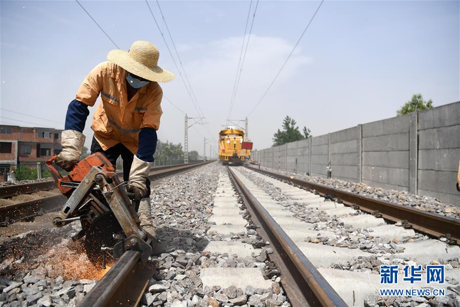 6月3日,施工人员在京九铁路线上进行更换水泥枕施工。 近日,由中国铁路上海局集团有限公司上海工务大修段、上海大机运用检修段等单位共同参与的京九铁路下行线颍南至三塔镇区间9.7公里水泥枕更换工程有序进行。换枕施工完成后,将进一步提升线路的安全性和稳定性,为即将到来的暑运保驾护航。 新华社记者 刘军喜 摄