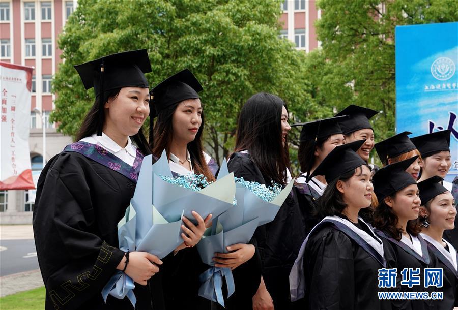 6月12日,在上海健康医学院,林佳敏(左一)和同学们一起穿着学位服合影。新华社记者 刘颖 摄