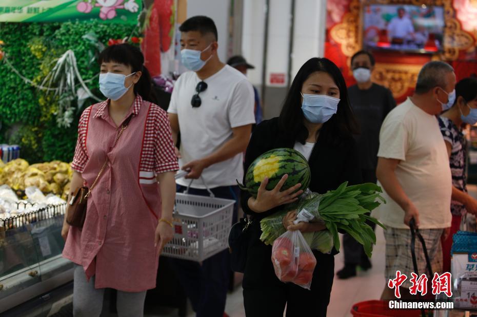 6月19日,北京市朝阳区一家京客隆超市内,市民怀抱采购的蔬菜和水果。京客隆集团在北京市内共拥有社区型超市、便利店120余家。自6月13日以来,京客隆日均有600余吨生鲜配送到各门店,供货量为平日的2到3倍。目前,北京大型连锁品牌超市生鲜供应基本稳定。 中新社记者 蒋启明 摄