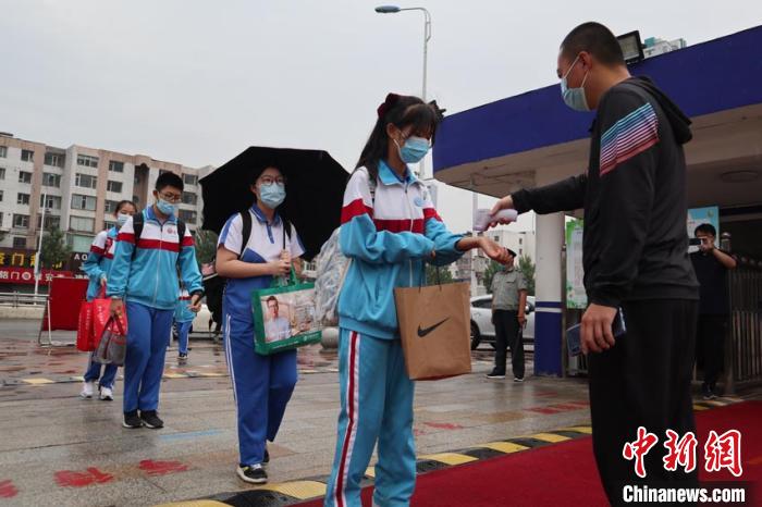 6时30分,该校初三学生陆续返回校园。在校门前,他们按照地面上的标识保持间距,经过测温、手部消毒后进入教学楼。当天,729名初三年级学生错峰、错时抵达教室。