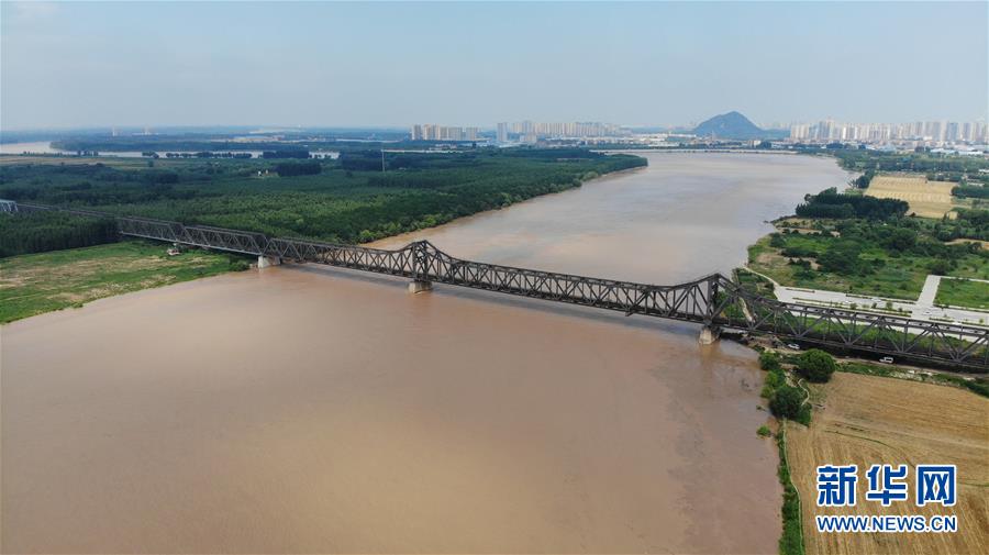 图为6月30日拍摄的黄河济南段泺口黄河铁路大桥附近的河面(无人机照片)。 7月2日,记者从黄河水利委员会山东黄河河务局了解到,受上游水库腾库下泄影响,黄河大流量洪水目前正流经山东省。6月30日上午7时,山东东明县高村水文站出现本次大流量过程峰值5120立方米每秒,此后大流量水头继续在山东省河道演进。预计黄河山东段大流量过程将持续到7月10日左右。 新华社记者 王凯 摄