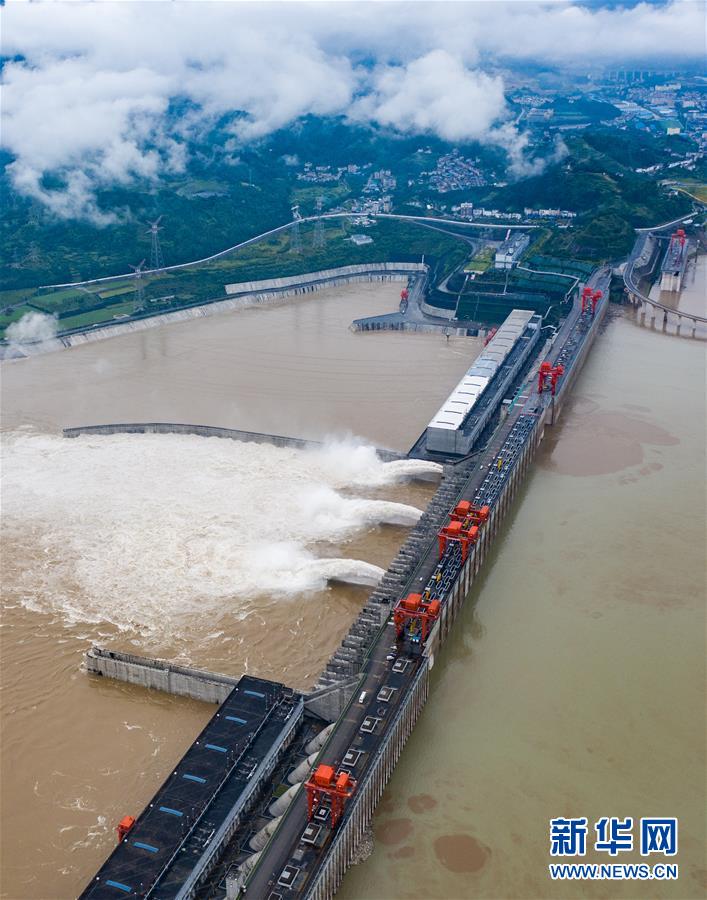 长江三峡枢纽开启泄洪深孔泄洪(7月2日摄,无人机照片)。新华社发(郑家裕摄)