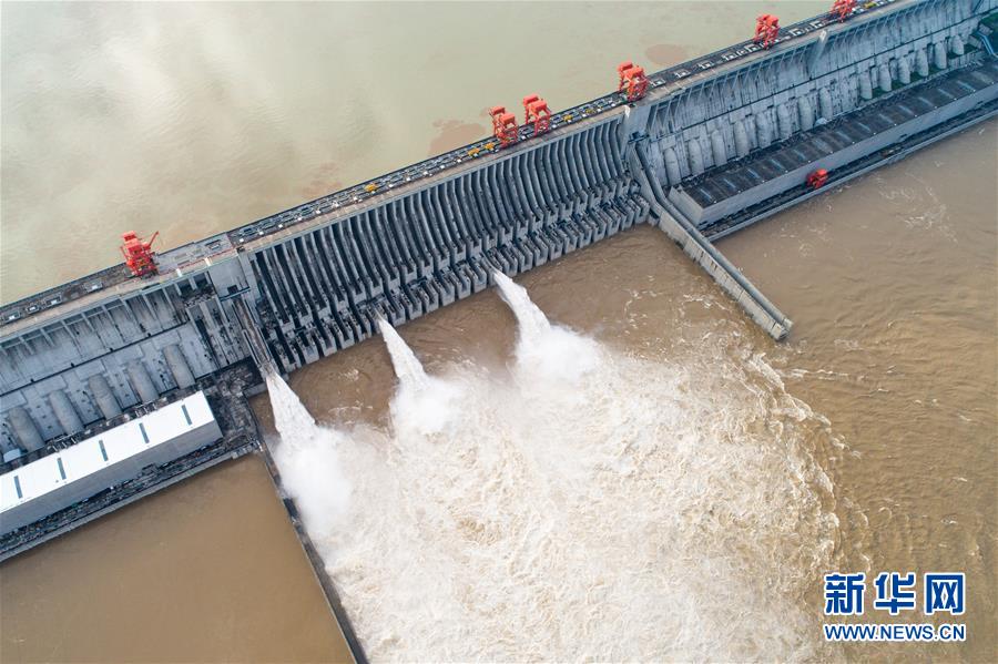 长江三峡枢纽开启泄洪深孔泄洪(7月2日摄,无人机照片)。新华社发(王罡摄)