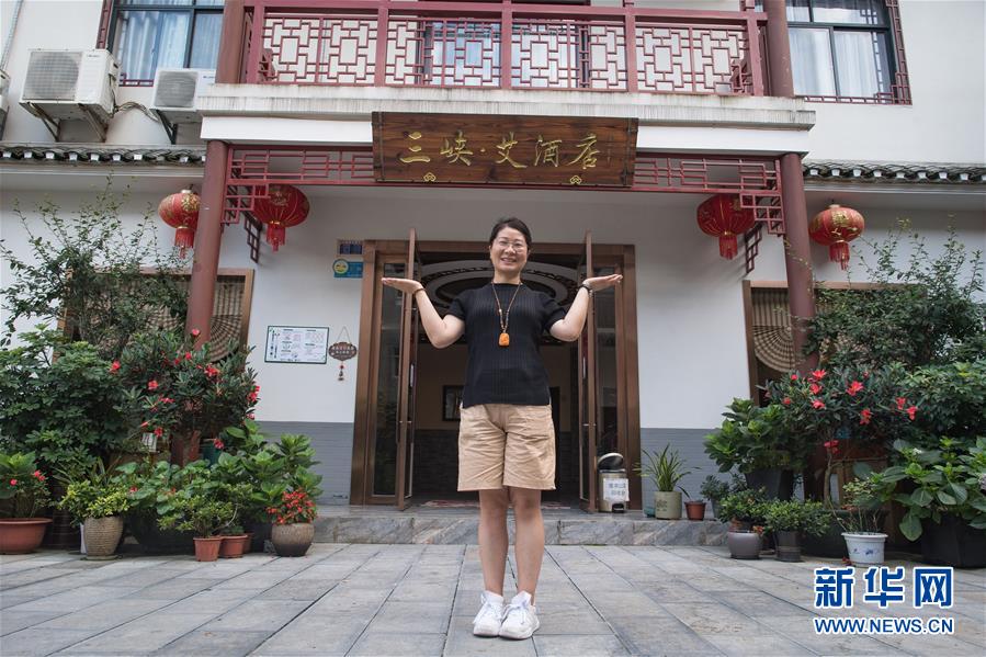 6月29日,村民谢蓉展示自己创办的“三峡·艾”主题民宿酒店。新华社记者 肖艺九 摄