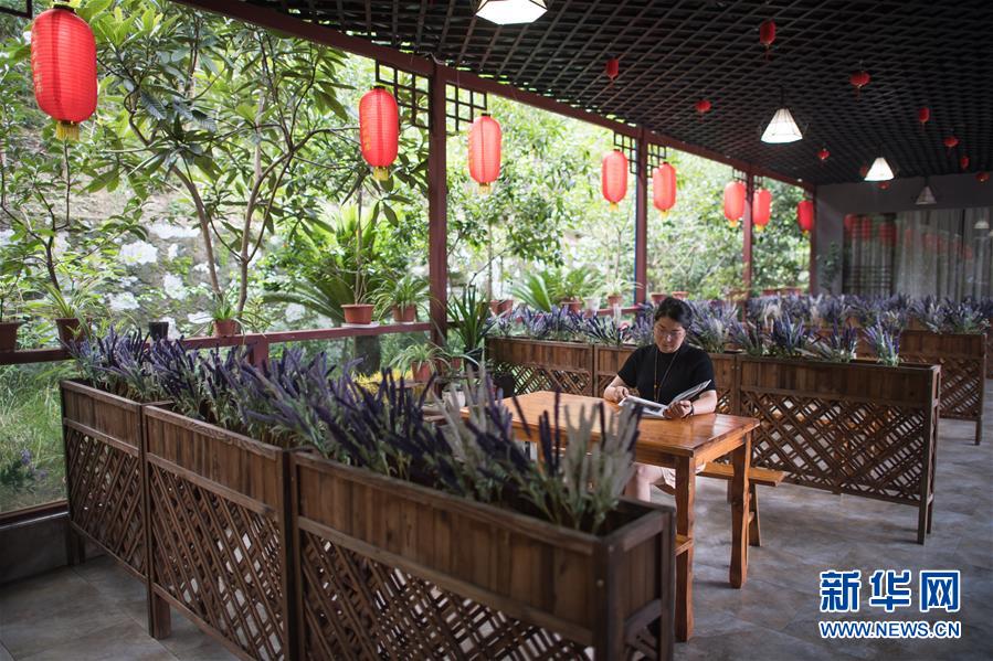 6月29日,村民谢蓉在自己创办的“三峡·艾”主题民宿酒店内看书。新华社记者 肖艺九 摄