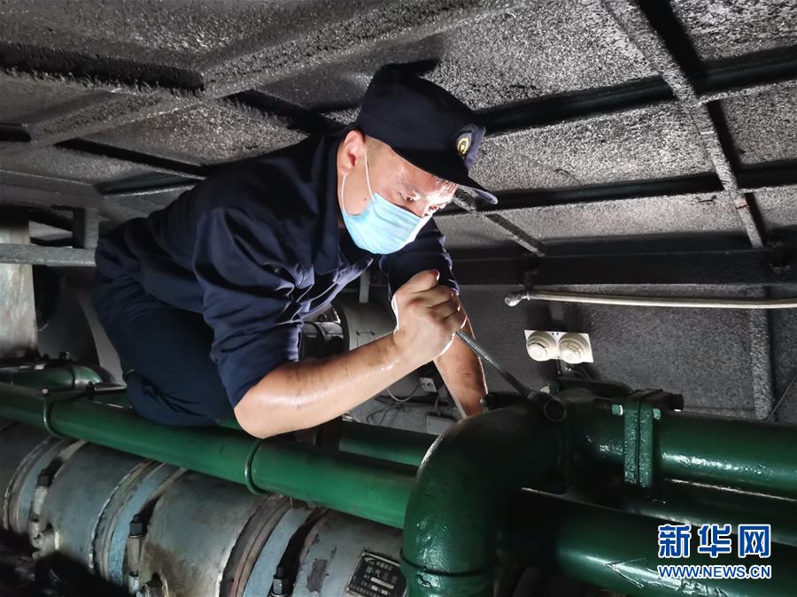 中国铁路北京局集团公司天津机务段检修车间柴油机管路组成员跪伏在柴油机气缸盖上,对水管路进行检修(7月8日手机拍摄)。 47岁的李箭是中国铁路北京局集团公司天津机务段检修车间柴油机管路组班长。他所在的班组负责天津机务段110多台内燃机车柴油机油管路和水管路的检修工作。作为“机车医生”,他们时常要深入机车“腹腔”,仔细检查柴油机的每根“肠道”。 新华社发(窦世强 摄)