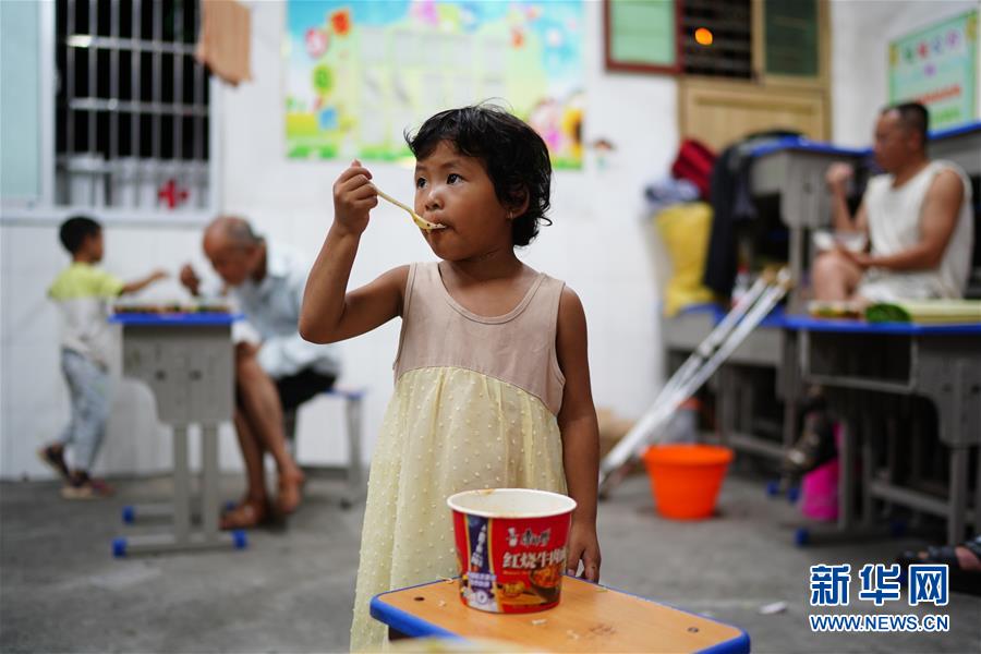 小朋友在江西鄱阳县五一中心学校安置点吃饭(7月9日摄)。新华社记者 周密 摄