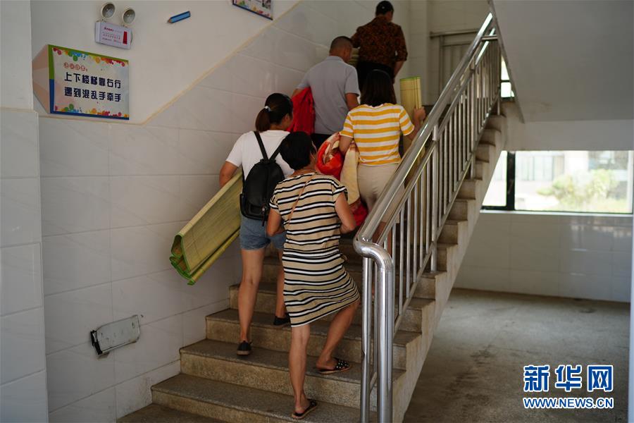 在江西永修县湖东学校安置点,群众携带行李前往安置住处(7月13日摄)。新华社记者 周密 摄