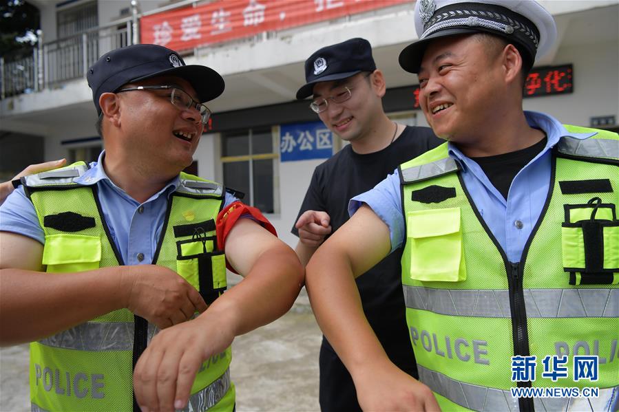 7月22日,梅玉胜(左)和同事在工作间隙开玩笑,查看身上晒黑的程度。新华社记者 彭昭之 摄