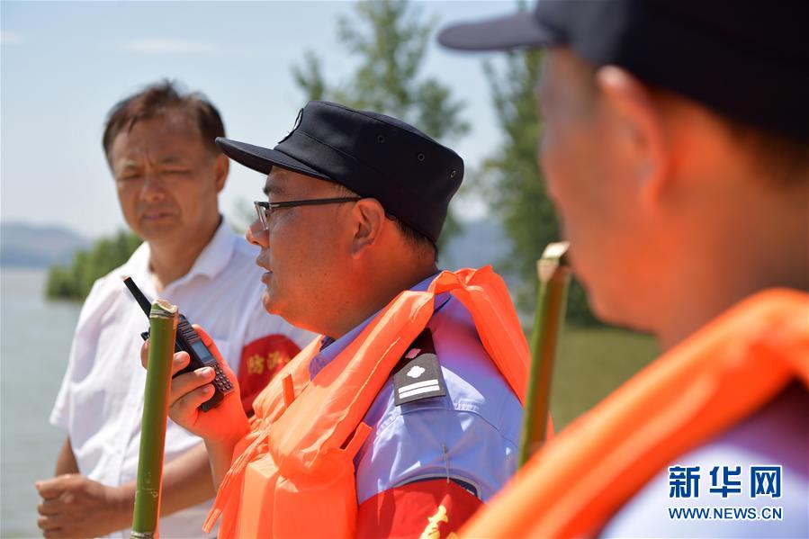 7月22日,梅玉胜(中)和同事们在防洪堤坝上巡逻,他通过对讲机和其他小组的同事沟通。新华社记者 彭昭之 摄