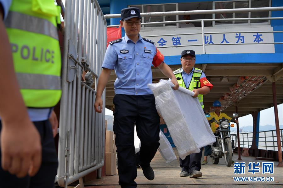 7月22日,梅玉胜(右)和同事在渡口协助防汛人员卸下防汛物资。新华社记者 彭昭之 摄