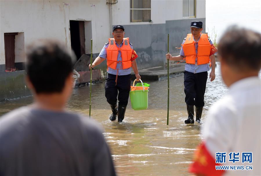 7月22日,梅玉胜(左二)和同事蹚水帮助一名家中进水的居民拿取生活必需品。新华社记者 彭昭之 摄