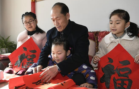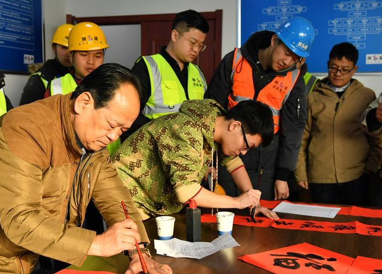 1月20日,社区组织书法爱好者为建筑工人书写春联。 当日,陕西西安新城区自强社区工作人员来到辖区的建设工地,为工人书写春联、福字,送去春节祝福。