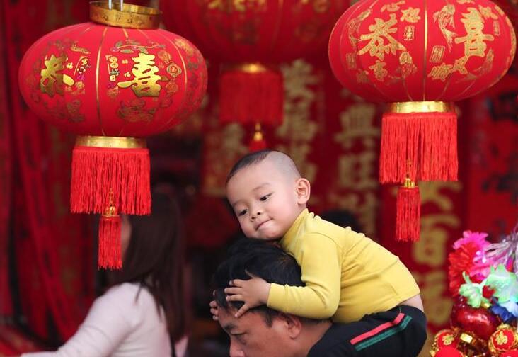 春节临近,广西南宁上海路上红红火火,市民前来采购春联、窗花等节日饰品。