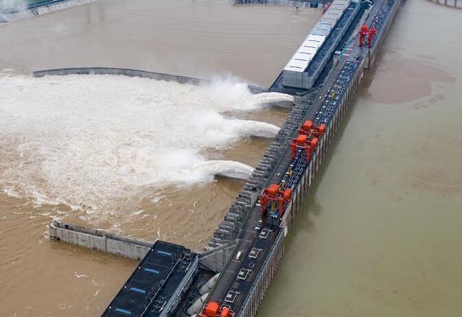 7月2日,长江清溪场水文站的测量船在长江上开展测量作业,长江三峡枢纽开启泄洪深孔泄洪。