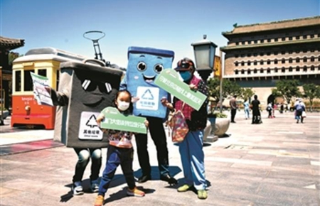 5月19日,游客与卡通人偶宣传员合影留念。当日是“中国旅游日”,北京天街集团在前门大街举行“”主题活动,宣传垃圾分类知识,引导游客文明出行,保护生态环境。