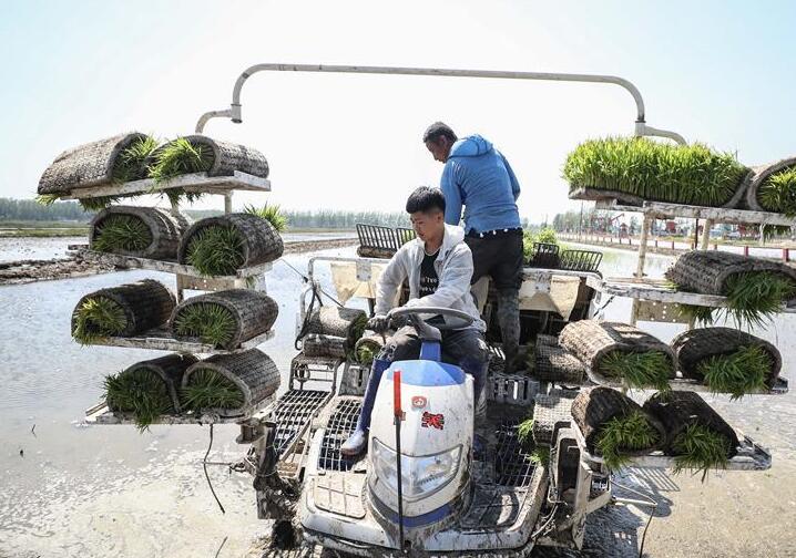 近日,在经过育苗、整地、施肥、除草等一系列步骤后,辽宁水稻主产区盘锦市的水稻插秧工作正在全面有序进行。