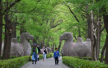 4月22日,游客走在南京紫金山明孝陵石象路上。当日是世界地球日,今年的宣传主题为“珍爱地球 人与自然和谐共生”。