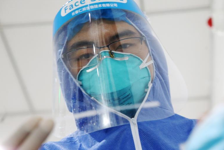 5月4日,重庆市黔江区疾病预防控制中心检验科王明对外来人员进行样本采集。 “五一”假期,重庆市黔江区疾病预防控制中心检验科的工作人员坚守在工作岗位上,进行新冠病毒核酸检测样本采集及检测工作。