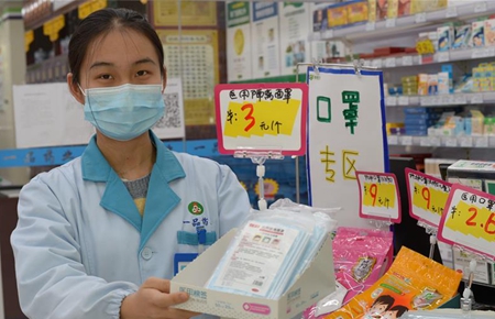4月14日,在贵阳市云岩区一家药店,服务员在展示口罩。 4月以来,贵阳市各药店口罩供应充足,口罩价格趋于平稳,规格、类型也较为齐全。