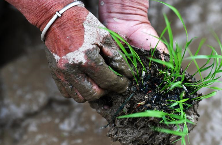 4月18日,贵州省从江县加榜乡加车村的农民在移栽稻谷小秧苗。 近日,贵州省从江县加榜乡雨量充足,梯田蓄水充盈,农民抢抓农时移栽稻谷小秧苗,梯田上一片繁忙景象。