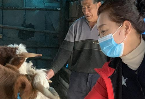 吉林省敦化市三河村党支部书记谷凤杰前去察看肉牛养殖情况。