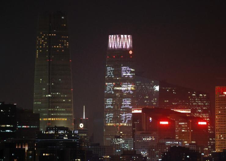 4月3日晚,北京CBD地区高楼为抗击新冠肺炎疫情亮灯,写有“战胜疫情”“致敬医护”“科学防控”“防控疫情”等字样。