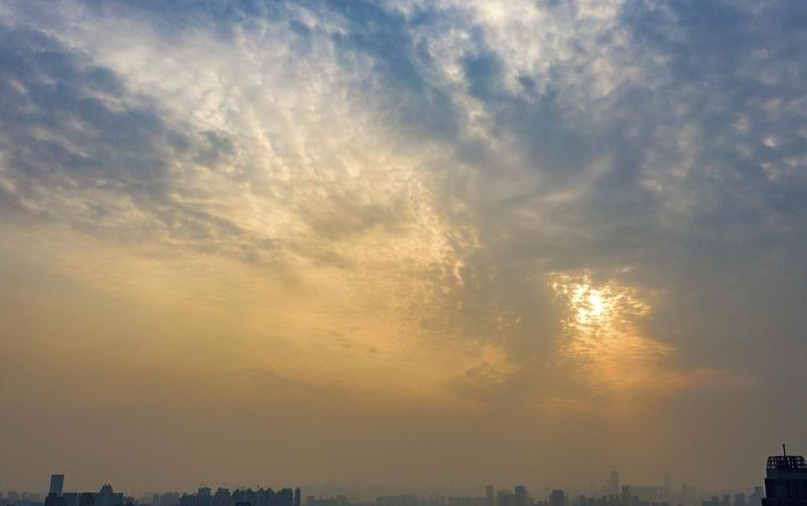4月4日在武汉市武昌区拍摄的晚霞(无人机照片)。 当天日落时分,武汉天空出现晚霞。