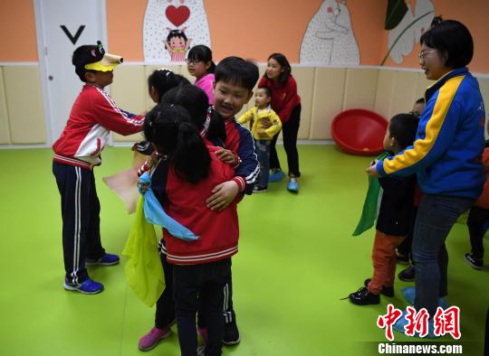 4月1日,来自福建师范大学大学协和学院的青年志愿者在和自闭症患儿一起交流玩游戏。 张斌 摄