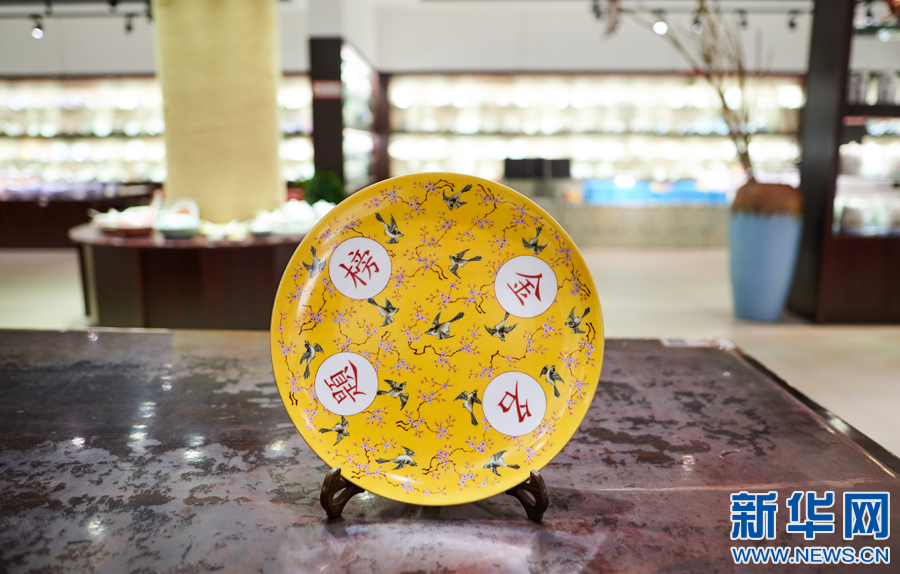 瓷盘整体装饰凸显景德镇御窑风格,黄釉彰显尊贵典雅,图案寓意与“金榜题名”相呼应,是传统与现代的碰撞,是千年瓷都与百年学府的结合。瓷盘打样后将进行批量制作,瓷盘背面将打印上每一位新生的姓名、录取的院系和专业。每一个瓷盘,都是独一无二的纪念。(新华网发 吴百强 摄)