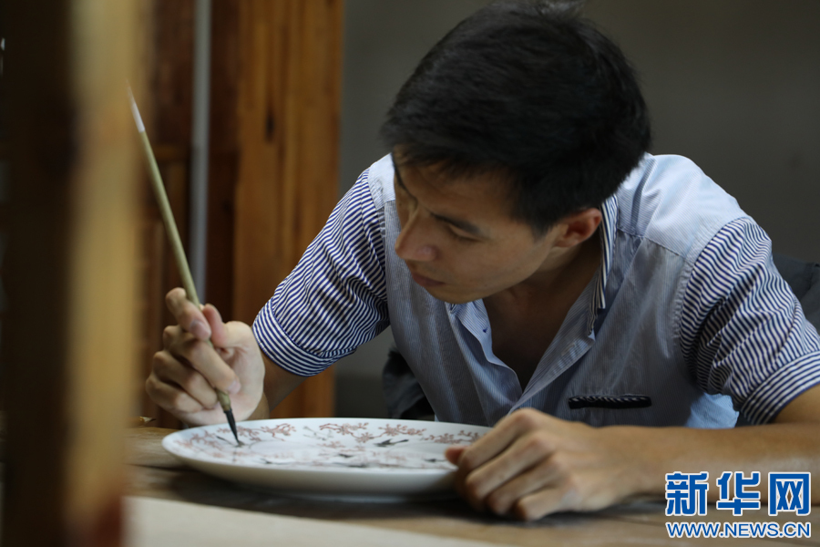 一笔一划都由工匠手工绘制。一只小小的喜鹊,需要有着十年经验的工匠花费半小时左右完成,每一根羽毛都清晰可见。这个纹饰是清代同治时期的典型纹饰,吉祥喜气,寓意“喜上眉梢”。(新华网 吴亚芬 摄)