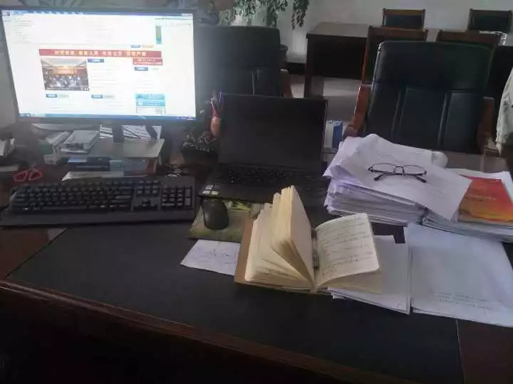 笔记本摊开在电脑前,一个半框眼镜放在一旁。桌面一角还有一个不太容易注意到的血压仪。