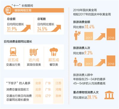 在购物消费方面,今年“十一”黄金周,以日用百货、大型家电和珠宝首饰等为主的购物类日均消费金额同比增长超40%。从消费总量看,北京、广东和河南位居全国前三名;从同比增速看,北京、重庆和甘肃增长最快。假日期间,中国银联联合全国逾3000家超市门店、逾3000家菜场共同展开的银联超市节、银联菜场节等大型营销活动如火如荼进行。活动开始以来,物美、大润发等超市银联网络交易量较活动开始前提升2—6倍,逾7万家菜场及周边生活圈商户的交易量整体提升1.4倍。