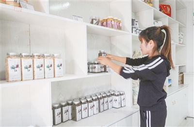 “草原人家”销售杜延芳在O2O体验店内摆放要销售的产品,目前店内线上销售的农畜产品多达40余种。