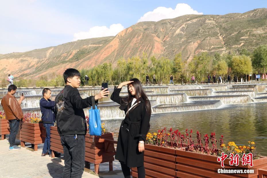 10月10日,民众在景色优美的北川河湿地公园内拍照留念。据了解,北川河湿地公园是西宁市面积最大的湿地公园,总面积约173.5公顷,整个水域面积约为95公顷,绿化面积约为60公顷,水景和绿景占全园面积的70%以上,拥有六个湖,五大园区。该湿地公园的的建成对西宁这样一座高寒高海拔干旱地区城市来说,有利于气候环境的改善。中新社记者 马铭言 摄