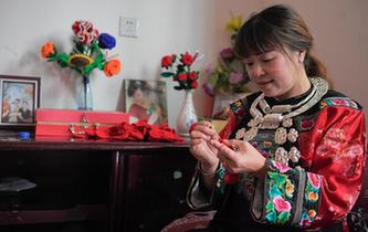 10月17日,凤凰县夯卡村村民在家中制作手工艺品。 位于湖南省湘西土家族苗族自治州凤凰县的夯卡村,曾是凤凰县最贫困的村庄之一。近年来,夯卡村通过易地搬迁与产业扶贫,带动村集体经济发展,有效助力脱贫。 新华社发(陈泽国 摄)