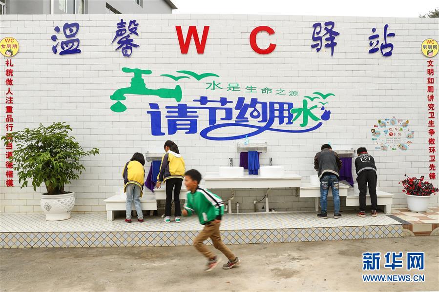 10月23日,一名学生在贵州省织金县黑土镇八甲小学的厕所门口的洗手池洗手,黑土镇八甲小学是10所项目学校之一。 新华社记者 张玉薇 摄