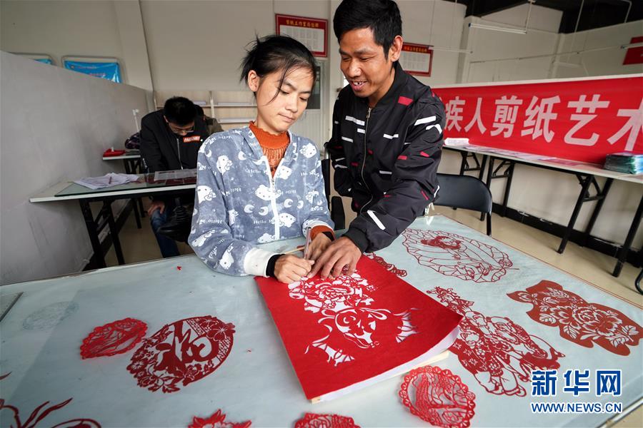 10月24日,在瑞昌市残疾人传统手工艺传习基地,剪纸师傅戴卫星(右一)指导残疾人程龙红(右二)学习剪纸。 新华社记者宋振平摄