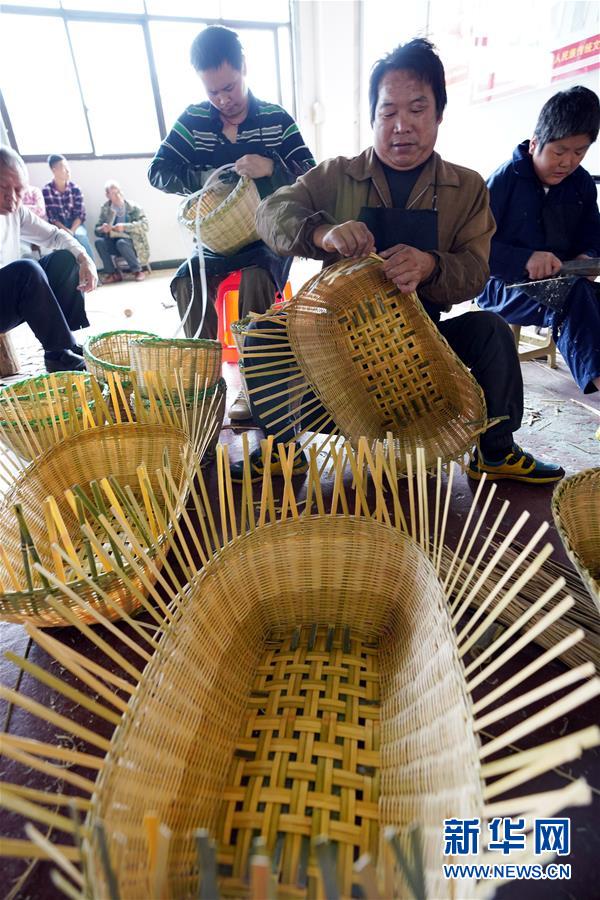 10月24日,在瑞昌市残疾人传统手工艺传习基地,竹编师傅程卫兵(右二)带领残疾人学徒制作竹编工艺品。 新华社记者宋振平摄