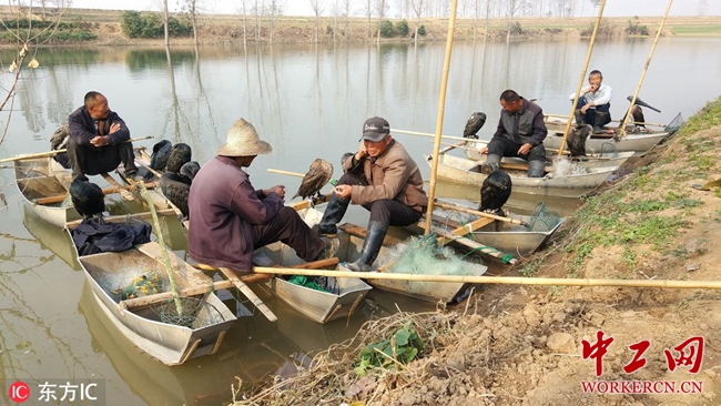 2018年11月4日,73岁的郭海山和放鹰同伴坐在船上休息。(图片来源东方IC,请勿转载)