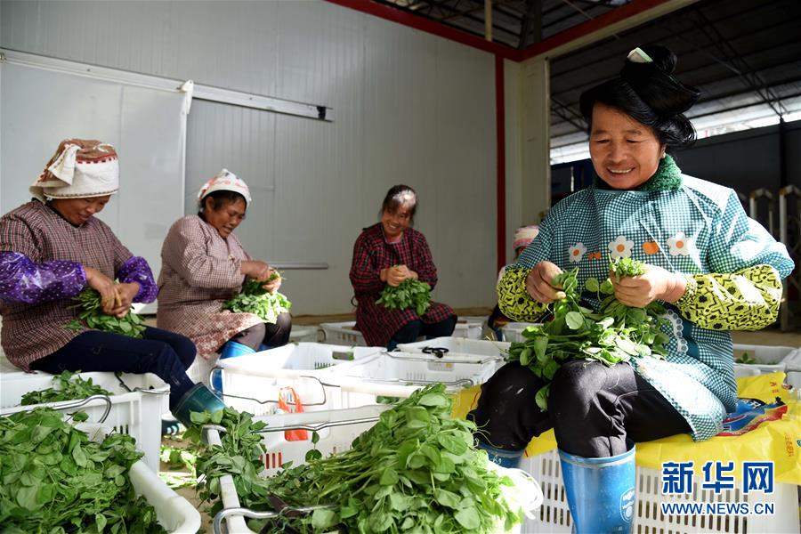 11月25日,在贵州省黔东南苗族侗族自治州榕江县,当地妇女在三鑫天源生态农业公司整理蔬菜。