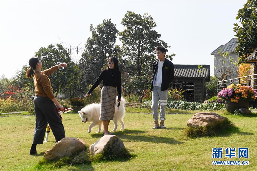 11月27日,在安吉县灵峰街道横山坞村,经营“青梨民宿”的村民蓝晴霞(中)与客人在院子里聊天。横山坞村共有11个村民小组,人口1635人,全村拥有民宿21家,民宿及乡村旅游直接从业人员约180人。