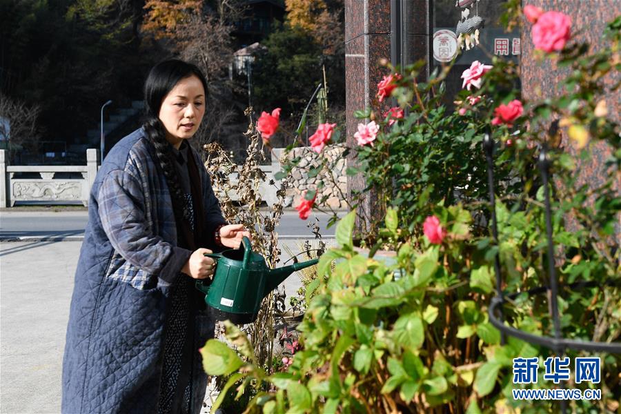 11月27日,在安吉县天荒坪镇大溪村,经营“大自然民宿”的村民陈美萍在院子里浇水。大溪村现有民宿202户,床位3500张,全村直接从事民宿及乡村旅游从业人员约1500人,占全村人口的70%以上。 新华社记者 黄宗治 摄