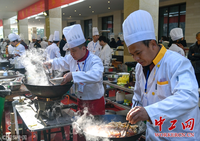 2018年11月29日,浙江省东阳市举办首届农村家宴厨师“东阳味道”评选大赛,来自各镇乡街道的40多位乡村厨师在东阳焐肉、红烧全鱼、东阳特色菜等东阳地方特色、乡土口味等传统烹饪方法上比厨艺、亮绝活。(本组图片来源视觉中国,请勿转载)