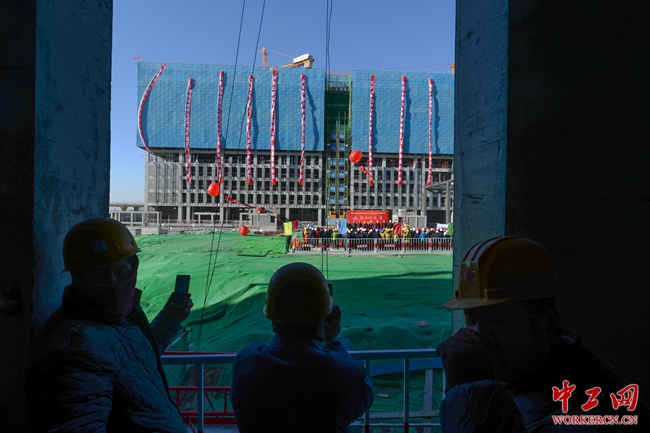 不少工人在建设的大楼里远眺封顶仪式现场。