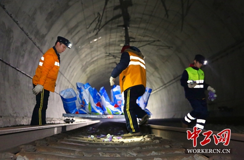 经过1小时运行,轨道车安全到达作业地点。16名高铁养路人从温暖舒适的轨道车下来,瞬间就被寒冷包裹着。远处,大别山已沉睡;深壑里,流水潺潺。他们似乎已经适应了这样的作业环境,井然有序地把工具和材料从轨道车卸下来,一顺溜地摆放整齐。工长江勇在班前会说:“现在的气温是-2℃,我们要坚持标准不放松 ,确保作业质量达标。”