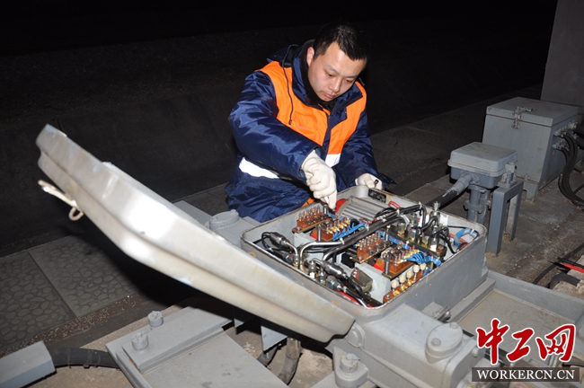 0时10分,“天窗修的时间下来了!”运转室内的值班员刘小东传达着消息;早已做好准备的信号工们便开始了设备检修作业。在冰冷的钢轨边,信号工们有的在弯着腰敲打设备上的螺栓,检查螺栓螺帽是否紧固;有的蹲在转辙机的旁边,检查内部的设备作用是否良好。由于动车的速度快,密度大,对设备的冲击力和挤压力也很大,很容易使紧固设备的螺栓松动;所以认真的检查、仔细的检修可以很大程度的减少列车运行中不安全隐患,保障旅客的出行安全。