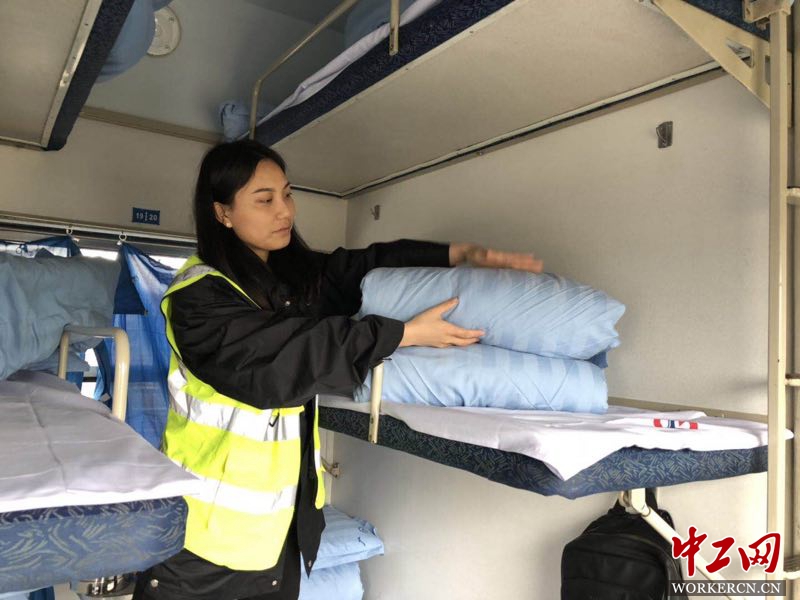 图为梁子薇正在车厢整理被子