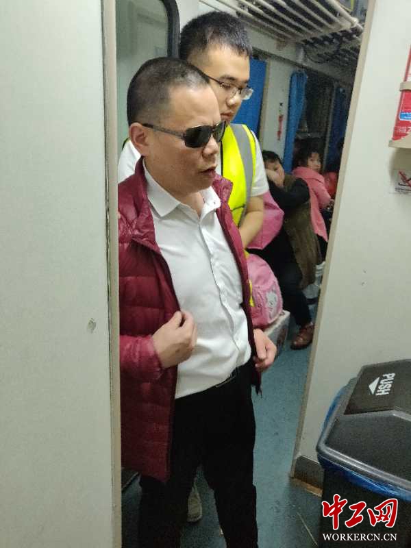 图为资衡正在帮助盲人旅客